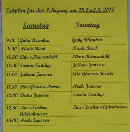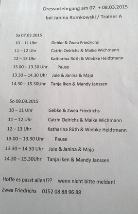 Am 07. und 08. März 2015 findet bei uns in der Halle ein Dressurlehrgang mit Janina Romkowski (Trainer A) statt. Hier findet Ihr den Zeitplan.